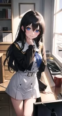 absurdres, highres, reflection, refraction, BREAK, 1girl, head up, holding a big cream puff, long black hair, close up, head up, blush cheeks, smile, portrait, hair between eyes, wet parted lips, sweat, dynamic lighting, detailed background, cafe, wooden floor, people, HDR, bokeh, depth of field, love, speech bubble, loafers,