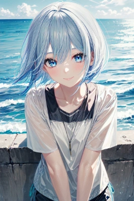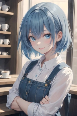 masterpiece, best quality, extremely detailed, anime <lora:lightline:0.2> <lora:hairdetailer:0.75> <lora:agomaru:-0.6> <lora:yawanuri:-1> <lora:gloweyes_v100:0.4> <lora:outline:-0.3> <lora:flat2:-0.2> <lora:make25d_type3_v100:0.2> <lora:deluster2:-0.45> <lora:boldline:-1>, girl, shorthair, blue hair, blue eyes, cool, cute, smile, upper body, frilled dress, ,