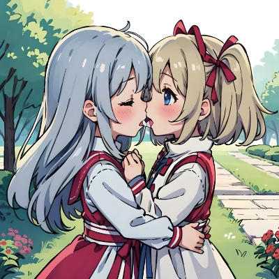 1girl little female child loli toddler preschooler two side up very long blonde hair navy blue serafuku navy blue sailor long dress long sleeves blue eyes navy blue pleated dress navy blue socks school uniform blush smile closed mouth long sleeves hair red bobbles red backpack standing on grass floral garden holding strap brown shoes slender thin legs fine art parody traditional media masterpiece best quality