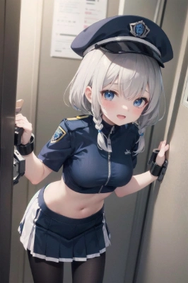 masterpiece, best quality, extremely detailed, anime, girl, skirt masterpiece, best quality, extremely detailed, anime, girl, skirt 3D art, caught in a dim cell, yellow bob hair, 1 yellow bear, small tits, yellow eyes, both hands are handcuffed on the back, prisoner clothes, legs are shackled, leaning forward and looking at the front with a crying face masterpiece, best quality, extremely detailed, anime, girl, skirt masterpiece, best quality, extremely detailed,(masterpiece, best quality), 1 woman, (partially unzipped crop top blue police suit:1.2), (big breast: 1.2), (deep slitted tight skirt:1.2), (ivory black pantyhose:1.2), (blue police cap:1.1), long brown hair, smiling, open mouth, (hands on breast:1.1), full lips, rosy cheeks, pale skin, soft facial features, (night:1.1), (gray eyes), urban city,,nNegative prompt: Mayng, nSteps: 20, Sampler: DPM++ 2M Karras, CFG scale: 7.0, Seed: 1142431729, Size: 768x1200, Model hash: 9771ad4f0e, Model: SD2Scream_v20, Seed resize from: -1x-1, Denoising strength: 0.5, Clip skip: 2, RNG: CPU, Version: v1.3.2, izayoi sakuya, braids, silver hair, blue eyes,