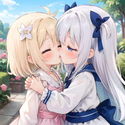 2girls yuri {{little female child}} loli toddler preschooler 幼児 two side up ツーサイドアップ long blonde hair long silver hair pink ribbon sash white dress long sleeves {closed eyes} outdoors floral garden from side embarrassed blush looking at each other kiss french kiss {{drool saliva}} {hugging} each other 2girls yuri<!>1girl