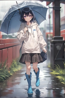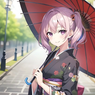1girl, solo, long hair, looking at viewer, blush, bangs, brown hair, hair ornament, long sleeves, holding, hair between eyes, brown eyes, jewelry, closed mouth, upper body, flower, earrings, outdoors, japanese clothes, looking back, hair flower, wide sleeves, kimono, blurry, sash, depth of field, blurry background, umbrella, obi, floral print, holding umbrella, print kimono, oil-paper umbrella, orange kimono