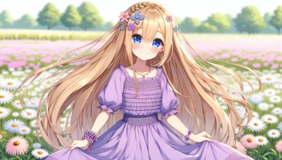 1人のとても小柄な女性。とても長く明るい金髪、とても長くまっすぐ流れるようなストレートヘアに小さな花飾り。白のフリルブラウス、ピンクのロングスカートを着ている。フラワーモチーフのブレスレットをつけている。襟元にピンクのリボン。青い目。顔を赤くして優しく微笑んでいる。花畑に立っている。スカートをつまんで挨拶している。ピンクの靴。とても詳細な描写。アニメ風