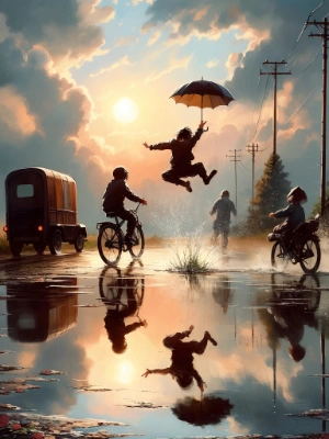 (kawaii background:1.3), (extremely detailed fine touch:1.3), (2D:1.2), ///, Blue background, oil painting, short gray hair, girl, jacket, pleated skirt, pale colors, fluffy atmosphere, gentle light, the world shines beautifully after the rain, rainbow, sunlight, clouds, sky, looking up at the sky, flowers on the street corner