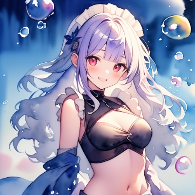 masterpiece, best quality, extremely detailed, (watercolor:1.5), (fantasy:1.3), 1girl, solo, kawaii, 15yo, small breasts, hands together,,maid in front of navel,midriff,navel cut out:1.5), huge breasts, beautiful detailed face and eyes, smile, (pale purple hair:1.2), long hair, wavy hair, blunt bangs, red eyes, flower diadem, flower hair ornaments, (water effect:1.2), (bubble effect:1.2),