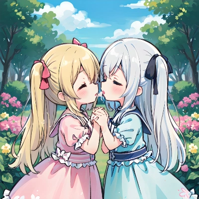 masterpiece best quality extremely detailed anime 2girls ((((little female child)))) ((loli)) ((toddler)) ((preschooler)) two side up long blonde hair long silver hair pink ribbon pink dress sash white dress long dress (closed eyes) floral garden from side embarrassed blush looking at each other kiss french kiss drool saliva trail hugging each other blue eyes beautiful landscape wide shot