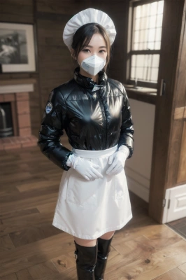 (photorealistic:1.4), (RAW photo), masterpiece, best quality, extremely detailed, lady, neat and clean, office worker, (pink respirator:1.1), suit, jacket, tight skirt, pink rubber gloves, over knee boots, shy look, smile, staring, standing,,