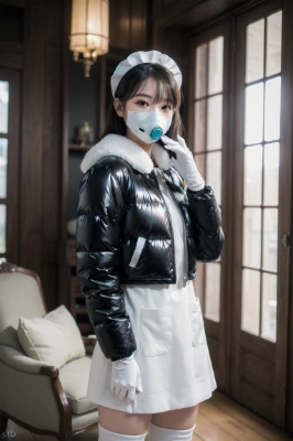 (photorealistic:1.4), (RAW photo), masterpiece, best quality, extremely detailed, lady, maid, white gloves, small white brim, (3D shaped respirator:1.2), white apron, (shiny black puffer jacket:1.2), knee high boots, neat and clean, elegant, polite, obedience, smile, staring, standing, living room, home,,