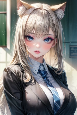 girl,RAW photo, best quality,realistic, photo-realistic, best quality ,masterpiece,an extremely delicate and beautiful, extremely detailed,2k wallpaper, Amazing, finely detail, 8k wallpaper,huge filesize , ultra-detailed, highres, extremely detailed,realistic, 8K, Ultra-High Definition, highest quality, ultra high resolution, (realistic:1.3), High quality texture, (2girls:1.1), Blazer, blazer uniform,, cat ears, cat tail, medium breast, blond hair, pattern, (tan:1.2), wet hair, , wet skin, (egg:1.6), daytime, <lora:flat2:-0.7> <lora:sanDka2:0.2>Class room,,