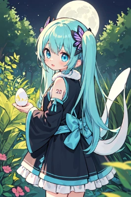 masterpiece, best quality, extremely detailed 1girl, hatsune miku, vocaloid, masterpiece, best quality, rating: general, newest <lora:bigeye:1> <lora:gloweyes_v100:1>,tail,longhair,blue hair,green hair,blue eyes,egg,fantasy,fairy,forest,flower,butterfly,night,night view,full ,full moon