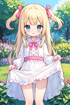 masterpiece best quality extremely detailed anime ((((little female child)))) ((loli)) ((toddler)) ((preschooler)) two side up long blonde hair pink ribbon pink sash white dress ((frills)) long sleeves standing white panties panty shot white panties dress lift outdoors floral garden kindergarten preschool embarrassed (((blush))) (tears) blue eyes,, <lora:flatBG:-0.5> <lora:hairdetailer:1>