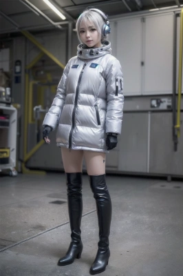 (photorealistic:1.4), (RAW photo), masterpiece, best quality, extremely detailed, lady, (future, cyber, space, metalic, silver, mechanical:1.3), (helmet, gas mask:1.1), puffer jacket, gloves, knee high boots, neat and clean, elegant, polite, obedience, smile, staring, standing, room,