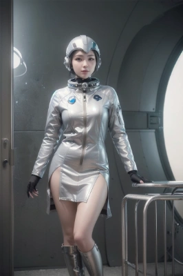 (photorealistic:1.4), (RAW photo), masterpiece, best quality, extremely detailed, lady, (future, cyber, space, metalic, silver, mechanical:1.3), (headphones, gas mask:1.1), puffer jacket, gloves, knee high boots, neat and clean, elegant, polite, obedience, smile, staring, standing, room,