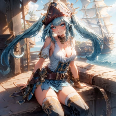 hires, cinematic angle,beautiful face,finely detail, masterpiece, best quality, ultra-detailed,Photorealistic,8k,lens flare,intense shadows,Studio,dreamy washes,bokeh photography,dreamy ambiance,beautiful detailed glow,colorful refraction,golden hour lighting,backlighting,colorful lighting,1girl,solo,full body,(watercolor \(medium\):0.25),<lora:watercolor:0.25>,<lora:midjourney_20230624181825:0.35>,(xuer swing:0.1),<lora:xuer swing_20240215221119:0.1>,<lora:flat2:-0.5>,<lora:genshinfull1-000006:0.8>,(beidoudef:1),beidou \(genshin_impact\) ,(cool woman,mature female,mature,30 years old:1.1),(left eyes red eyepatch:1.4),(cool woman,mature female,mature,30 years old:1.3),(slanted eyes,red eyes,long hair,dark brown hair,big hair,flowing hair,:1.2),large breasts,looking at viewer,(holding gun:1.2),sitting,smile,happy, (cool and sexy pirate,:1.3),(pirate hat,pirate costume,cleavage,miniskirt,waistcloth,leather belt,leather boots,:1.2),(pirate ship,:1.3),beautiful ocean,blue sky,wind,nature,fantasy,fancy,cute,