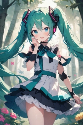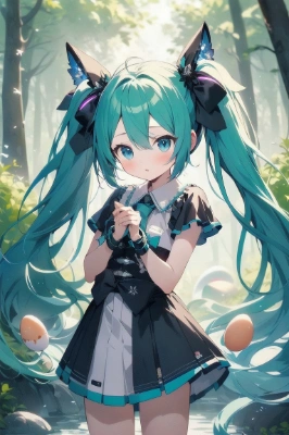 masterpiece, best quality, extremely detailed, anime masterpiece, best quality, extremely detailed1girl, hatsune miku, vocaloid, masterpiece, best quality, rating: general, newest,blue eyes,egg,fantasy,flower, atyou <lora:AimingAtYouV1:1>,forest, girl, egg, blue hair, green hair, blue eyes, twintail, longhair,