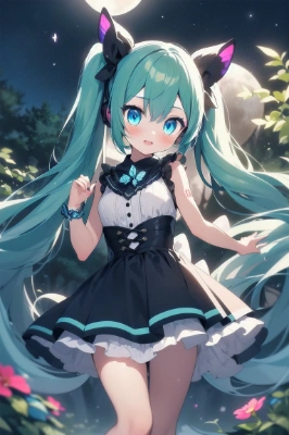 masterpiece, best quality, extremely detailed 1girl, hatsune miku, vocaloid, masterpiece, best quality, rating: general, newest <lora:bigeye:1> <lora:gloweyes_v100:1>,tail,longhair,blue eyes,blue hair,green hair,dream,makeup,fairy,fantasy,butterfly,full moon,night,flower,forest,