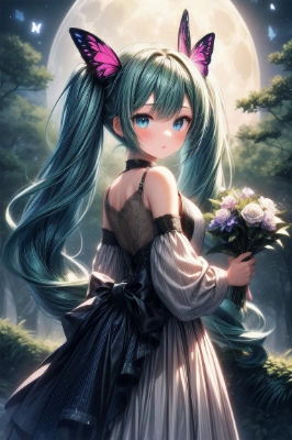 masterpiece, best quality, extremely detailed 1girl, hatsune miku, vocaloid, masterpiece, best quality, rating: general, newest <lora:bigeye:1> <lora:gloweyes_v100:1>,tail,longhair,blue eyes,blue hair,green hair,dream,makeup,fairy,fantasy,butterfly,full moon,night,flower,forest, makeup, dream, twintail, longhair, blue hair, green hair, blue eyes,