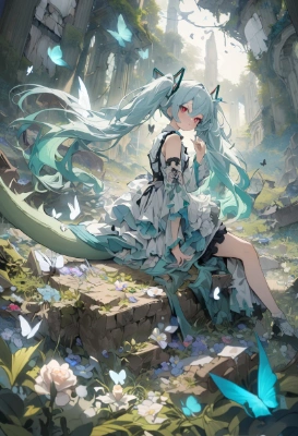 masterpiece, best quality, extremely detailed 1girl, hatsune miku, vocaloid, masterpiece, best quality, rating: general, newest <lora:bigeye:1> <lora:gloweyes_v100:1>,tail,longhair,blue eyes,blue hair,green hair,dream,makeup,fantasy,butterfly,t,t,t,ruins,flower,forest, girl, makeup, dream, twintail, longhair, silver hair, red eyes, white hair, girl, makeup, dream, twintail, longhair, silver hair, white hair, red eyes, purple eyes, odd eyes, girl, makeup, dream, twintail, longhair, silver hair, white hair, pink eyes,