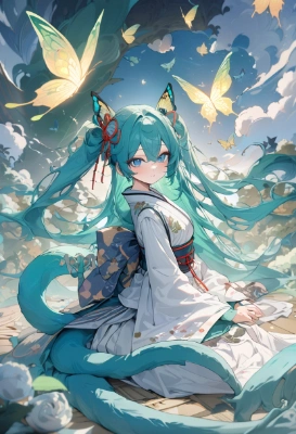 masterpiece, best quality, extremely detailed 1girl, hatsune miku, vocaloid, masterpiece, best quality, rating: general, newest ,tail,longhair,blue eyes,blue hair,green hair,dream,makeup,fantasy,butterfly,t,t,t, <lora:bigeye:1> <lora:gloweyes_v100:1>,Japanese style, makeup, dream,