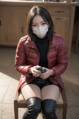 (photorealistic:1.4), (RAW photo), masterpiece, best quality, extremely detailed, lady, (red short puffer jacket:1.1), leather short pants, (knee high boots:1.2), elegant, neat and clean, almond shaped eyes, smile, staring, sitting on chair, home, dining, sexual frustrated, tongue licking, (mask:1.2),,