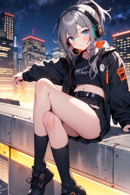 Age: 16 years old, female, dark gray hair color, ponytail, navy blue eyes, black jacket with orange line pattern, exposed belly button, black T-shirt, black skirt, black socks, black headphones, belt ornaments on thighs, absolutely Area, flat chest, standing posture, (facial expression: smiling), futuristic city, starry sky.,