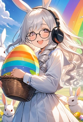 ((pastel color theme, yume kawaii)),masterpiece, best quality, extremely detailed, anime, absurdres,(((beautiful sky, rainbow))), (soap bubbles), (solo girl), (((white hair, long drill hair))), original character, (((sleepy face))), ((thick-rim glasses,headphone, white lolita fashion)), upper body, holding a pillow, (((white rabbits))),<lora:saturation:0.25> <lora:hyperdetailer_v060:1> ,,,,