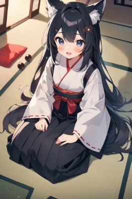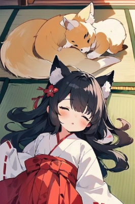 insanely detailed,anely detailed,a girl,illustration,(fine hair, while sleeping ,fox girl,black hair,ultra Super long hair,somewhat drooping eyes,childish face,babys face,(Smaller than average height)),(shrine maiden outfit,(red hakama (e.g. worn by miko or noblewomen at court))), flower hair ornament ,tatami room,Lie down<lora:flat2:0> ,,