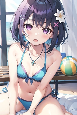 1girl, solo, blush, bangs, hair ornament, dress, ribbon, closed mouth, blue hair, closed eyes, short sleeves, cowboy shot, lying, puffy sleeves, on back, medium hair, two side up, puffy short sleeves, pillow, bed, blue dress, on bed, sleeping, facing viewer, object hug, holding pillow