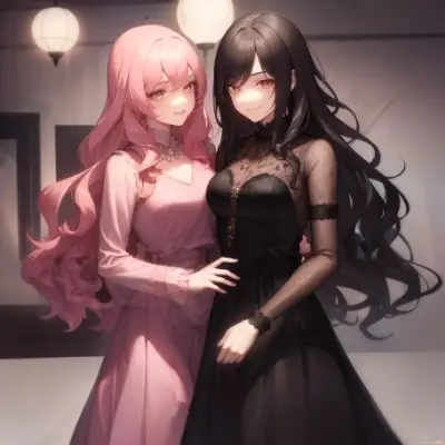 masterpiece, cinematic lighting, ultra detailed, 2 girl, yuri,girl A black long hair, taller than girl B, seductive smile, wearing pink girly dress, girl B (brown wavy hair:1.1), detailed dress, <lora:hauteCouture_v11:0.5>