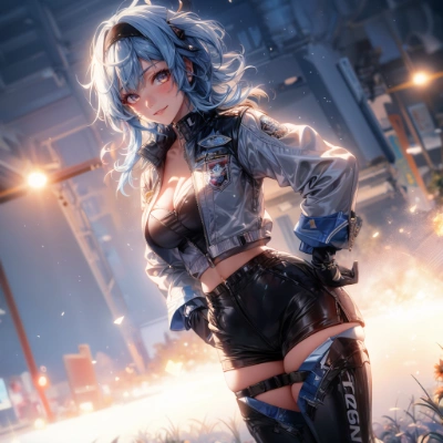 hires, cinematic angle,beautiful face,finely detail, masterpiece, best quality, ultra-detailed,Photorealistic,8k,lens flare,intense shadows,Studio,dreamy washes,bokeh photography,dreamy ambiance,beautiful detailed glow,colorful refraction,golden hour lighting,backlighting,colorful lighting,1girl,solo,full body,dutch angle,(watercolor \(medium\):0.25),<lora:watercolor:0.25>,<lora:midjourney_20230624181825:0.35>,(xuer swing:0.15),<lora:xuer swing_20240215221119:0.15>,<lora:flat2:-0.5>,<lora:eula2-000009:0.7>,(euladef:0.3),eula \(genshin impact\),(cool woman,mature female,mature,30 years old:1.1), (light blue hair,long hair flaps,short hair:1.2),frizzy hair,medium breasts,looking at viewer,(hands on own hips,:1.2),smile,( race queen,:1.2),( race queen tight-fitting