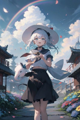 masterpiece, best quality, extremely detailed, anime, a girl, (white elephant head shaped hat), White hair, black and white clothes, skirt, flower garden, rainbow, seven colored clouds, hanafubuki, petals dancing in the wind, buddhist temple, Chinese style <lora:yawanuri:1> <lora:floatingmix2:1> ,