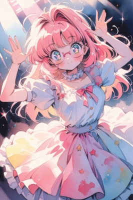 (masterpiece, best quality, beautiful detailed eyes, ultra-detailed, finely detail, highres), kyoto Animation, (1 beautiful woman), solo, (80s city pop illustration) neon color illustration, glasses, (pink haze), beautiful amazing art, complicated background, In a dream, dreaming in a fantasy land, kawaii illustration, falling, Above the town, above the sky, studio ghibli style, fallen angel, ,