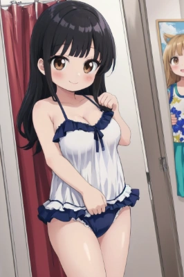 masterpiece, best quality, extremely detailed, anime, child girl, big breasts, camisole swimsuit with frill, fair skin, black inwardly curled hair, brown eyes, smile, fitting room, <lora:eyecolle_himawari_v100:1> ,