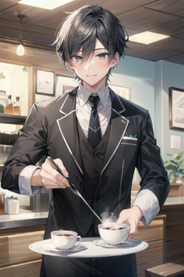 masterpiece, best quality, extremely detailed, anime, A young man, a butler, a young little lady, girl being held up by a butler, smile, gorgeous garden,