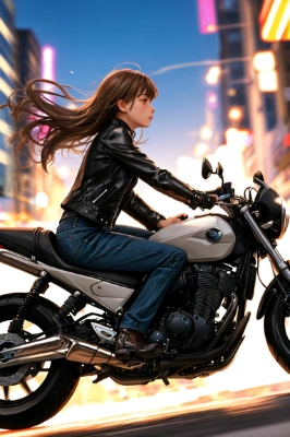 (a girl riding a motorcycle at full speed:1.3), (from side:1.1),(only one leg is visible:1.3),