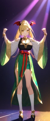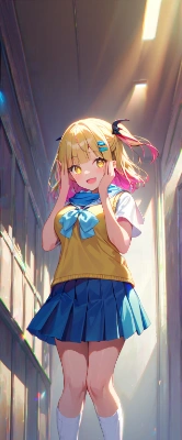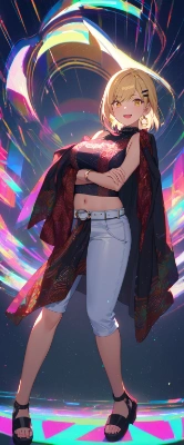 1girl, A kawaii lustful vampire girl with extra short hair and buzz cut and sidelocks and bangs and yellow eyes and large breasts and baby face and droppy eyes is standing on street. Thumbs up, looking at viewer, laughing, (pink hair streaks:1.0), (blonde hair:1.1), (bat hair ornaments, hairclip, steampunk style, dark green victorian blouse, puff sleeve, short sleeves, leather chest harness, leather underbust corset, leather culottes shorts, lolita drawers, leather garters, leather lace up thigh high boots, leather belt pouch with pocket watch and key charm, ruffle tie, leather fingerless gloves, wrist watch, gear earrings), (energetic compositions, abstract particles, abstract background:0.7), (chromatic_aberration:0.6), (depth of field, full body:0.9), (from side:0.1), close to viewer, (illustration, colorful lighting:1.1), Masterpiece, top quality, very detailed, <lora:flat2:-0.85> <lora:boldline:-1>