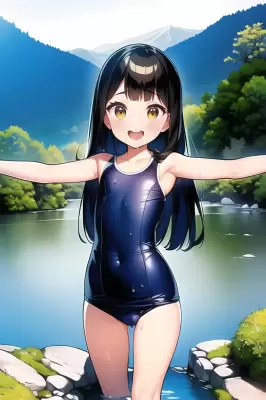 masterpiece, best quality, {{{{uncensored}}}} ultra-detailed, extremely detailed CG unity 8k wallpaper, harmonious, perfect anatomy, perfect finger, {{{{overcoating painted}}}}, outline, {{{little girl}}}, {{{child toddler}}}, {{{loli}}}, round face, {{flat chest}}, puffer nipples, very long hair, {{wavy hair}}, {{blunt bangs}}, {{evil smile}}, open mouth, wet hair, {{{{{{{T-pose}}}}}}}, {{{{{Spread arms horizontally}}}}}, {{airplane_arms}}, standing, {{{{{school swimsuit}}}}}, {{beautiful background}}, {{{{{Japanese style mountain stream}}}}}, {{{in water}}}, cinematic light, beautiful detailed glow, cinematic shadows, beautiful water