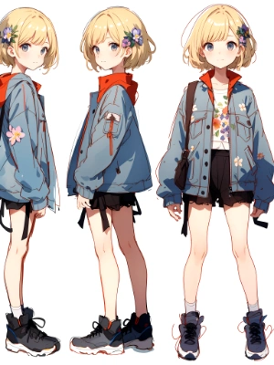 (extremely detailed fine touch:1.3), (flower background:1.3), watercolor, (rough sketch:1.5), (hard light, studio light, light rays, dappled light, reflection, shadows, ray tracing:1.0), ///, kawaii girl, short hair, blonde, sneakers, jacket, girl, figure