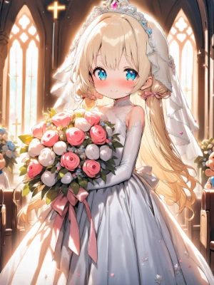 1girl ((little female child)) ((loli)) ((toddler)) ((preschooler)) two side up (very long) blonde hair white serafuku white sailor long dress white pleated dress white socks school uniform short sleeves blue eyes blush smile closed mouth long sleeves hair red bobbles red backpack looking at viewer standing on grass floral garden holding strap brown shoes (thin) (skinny) (slender) masterpiece best quality