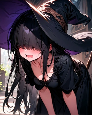 1girl, hair over eyes, wavy mouth, black hair, long hair,