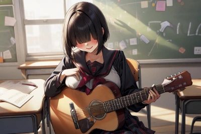 (a girl playing the guitar:1.4), masterpiece, best quality, 1girl, glasses, A girl sitting on the bed, a girl playing the guitar, black hair, short hair, An old radio on the desk, a girl listening to the radio with headphones on, delicate colors, illustration, bright colors, beautiful