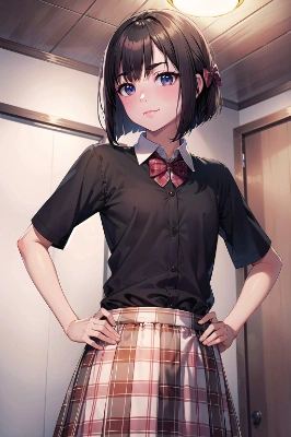 BREAK (black short bob, straight hair:1.4), bangs, (hair over both eyes:1.9), (tsurime:2.1), (very thin eyes:1.4), closed mouth, (look down on disdain:1.9), (blush:1.4), (flat chest:1.7), right hand on chest, left hand on desk, BREAK from side, school uniform, plaid bow, (round collared cutter shirt:1.6), (plaid midi skirt:1.6), white short socks, brown loafers, BREAK standing, unmoving pattern, school classroom