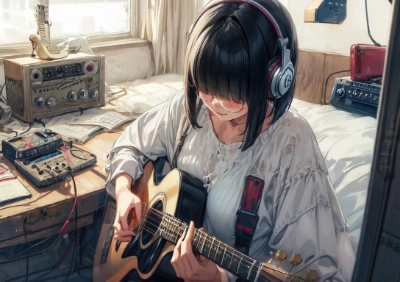 (a girl playing the guitar:1.4), masterpiece, best quality, 1girl, glasses, A girl sitting on the bed, a girl playing the guitar, black hair, short hair, An old radio on the desk, a girl listening to the radio with headphones on, delicate colors, illustration, bright colors, beautiful