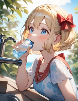 1girl, blonde hair, blue eyes, red ribbon in hair,(hair bow:1.4),red bow, short haircut, sitting by waterfall, in rays of sunlight shining through trees, looking pensive, lost in bittersweet memories, delicate features, highly detailed, sharp focus, illustration, (blonde hair:1.2), (blue eyes:1.2), (red ribbon:1.1), (short haircut:1.1), (sitting by waterfall:1.2), (in rays of sunlight:1.1), (looking pensive:1.2), (lost in bittersweet memories:1.3), (delicate features:1.1), (highly detailed:1.2), (sharp focus:1.1), (illustration:1.1)