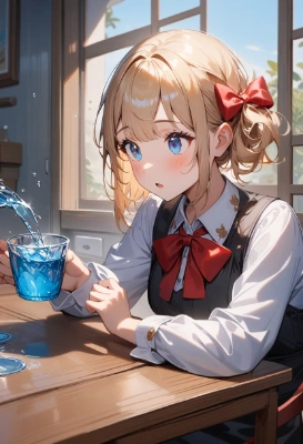 1girl, child, blonde hair, short hair, blue eyes,(hair bow:1.4),red bow, red hair ribbon, trying on knight armor, struggling, cute, pouting face, clothes too big, sleeves too long, helmet covering eyes, detailed full body, full armor, sword, inside bedroom, clothes and toys scattered around, sunbeam through window