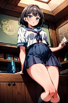 (((((solo,1 mature woman))))),masterpiece,whole body,best quality, extremely detailed face,anime,sailor schooluniform,blue Skirt,very small breasts,view from front,medium short hair,black hair,muscle,black hair,anime face eyes,gray eyes,provocative face,slanted eyes,(downpour),