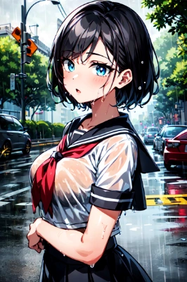 (((((solo,1 mature woman))))),masterpiece,whole body,best quality, extremely detailed face,anime,sailor schooluniform,blue Skirt,Flat breasts,view from front,medium short hair,black hair,muscle,black hair,anime face eyes,gray eyes,provocative face,slanted eyes,(downpour),