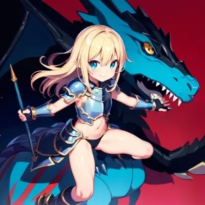 (knight, hero, armour, dragon), (bikini, navel:0.8), gallant smiling, honor, pride, long blonde hair, legs, whole body, dynamic angle,