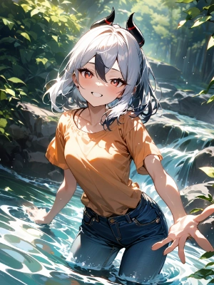 The girl's clothing should be appropriate for a casual outdoor setting, such as a light jacket or sweater, jeans or leggings, and sneakers. Her posture should convey a sense of calm and contemplation, as she takes in the beauty of the post-rain landscape.