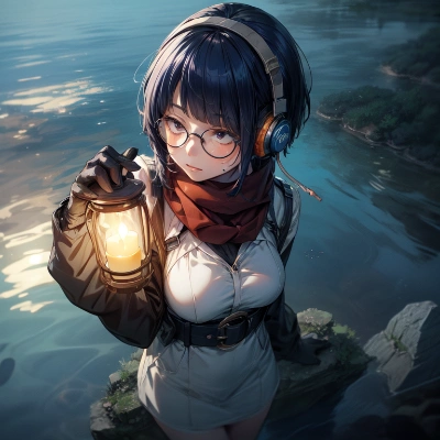 A toy figure wearing a headset and holding a handheld lantern, a girl illuminated by under water, 1girl, (glasses), solo, blue hair, gloves, A canvas-colored scarf that covers the lower half of the face, Eyes that shine like jewels, full body,